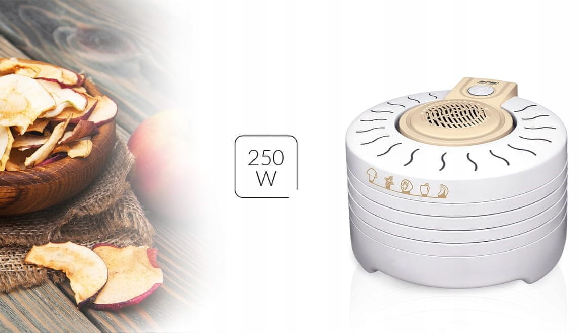 Dehidrator hrane MSG-03 je praktična naprava, ki olajša sušenje različnih izdelkov doma. Omogoča vam podaljšanje svežine in privlačnosti poletnega sadja, zelenjave, gob in zelišč ter ohranjanje njihovega naravnega okusa in arome več mesecev. Štiri prostorne, nastavljive sita zagotavljajo priročen prostor za sušenje večjih količin izdelkov hkrati. Postopek sušenja poteka počasi in pri pravi temperaturi, ki je podobna naravnim pogojem, kot sta sonce in veter. MSG-03 ni popoln le za sušenje hrane, temveč tudi za ustvarjanje dišečih okraskov s suhim cvetjem, kar je idealno za domači potpuri. Višino sita lahko preprosto prilagodite velikosti kosov, ki jih sušite, nadzor temperature pa vam omogoča sušenje občutljivih rastlin, kot so rože, pri nižji temperaturi. Prednosti: ⚪️ Štiri prostorna sita omogočajo sušenje večjih količin hkrati. ⚪️ Sita z nastavljivo višino omogočajo prilagoditev višine sita velikosti kosov, ki jih sušite. ⚪️ Nadzor temperature – natančen nadzor postopka sušenja, idealen za različne izdelke. ⚪️ Naravno sušenje – postopek sušenja, ki posnema naravne pogoje (veter in sonce). ⚪️ Vsestranska uporaba – za sušenje hrane, rož in pripravo domačih zmesi. ⚪️ Kompaktna velikost – enostavno shranjevanje in uporaba v kuhinji. Parametri: ⚪️ Moč: 250 W ⚪️ Število sit: 4 ⚪️ Premer sita: 28 cm ⚪️ Nastavitev pretoka zraka: 3 stopnje ⚪️ Štiri sita z nastavljivo višino ⚪️ Barva: Bela ⚪️ Značilnosti: Hitro in učinkovito suši: gobe, sadje, zelenjavo, zelišča, rože ABC – Sušenje gob Gob pred sušenjem ne umivajte. Očistite jih s krtačo ali rahlo vlažno krpo. Sušenje gob običajno traja približno 6 ur. Pravilno posušena goba se bo odprla le, če jo močno pritisnete. Končane konzerve shranjujte v tesno zaprtih kozarcih ali kovinskih posodah. Posušene gobe lahko zmeljete tudi v prah in jih uporabite kot aromatično začimbo za meso, omake in juhe. Najhitrejše sušenje: Dehidrator hrane MSG-03 je opremljen s petimi siti, ki jih je mogoče nastaviti po višini. Gobe ali druge izdelke narežite na kose, ki so dovolj veliki, da se udobno prilegajo med sita. Pretok zraka se aktivira z gumbom na zgornjem pokrovu. Zdravi prigrizki: V dehidratorju lahko sušite več kot le gobe. Uporabite sveže sadje in zelenjavo, zelišča in cvetje ter uživajte v njihovih naravnih lastnostih. Posušena zelišča lahko uporabite kot osnovo za zdrav, aromatičen čaj ali kot nadomestek za kupljene zelenjavne kocke. Suho sadje in zelenjava sta odlična alternativa zdravemu in sladkemu prigrizku za otroke. Domač čips ne vsebuje konzervansov in nezdravih sladil. Dodaja energijo in predvsem zagotavlja dragocene mikroelemente in vitamine.