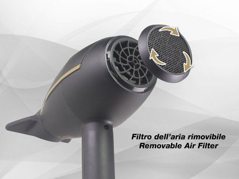 Profesionalni sušilnik za lase z AC motorjem in kompaktno, moderno zasnovo. Šest nastavitev z dvema različnima izbirnima hitrostma in tremi temperaturnimi stopnjami ter hladen sunek za popolno sušenje in fiksiranje. Funkcija ionov za sijoče lase in oblikovanje brez statike. Opremljen z dvema koncentratorjema zraka: širša 9-milimetrska šoba zajame celotno krtačo v enem samem prehodu, zato je ta koncentrator idealen za hitro in gladko oblikovanje; druga, ožja in tanjša 7-milimetrska šoba omogoča koncentriran pretok zraka, zaradi česar so lasje gladki in elegantni. Difuzor za definiranje kodrov, naravnih valov in dodajanje volumna. Z zaščito pred pregrevanjem in odstranljivo zadnjo rešetko za enostavno čiščenje. 250 cm napajalni kabel za priročno sušenje.
