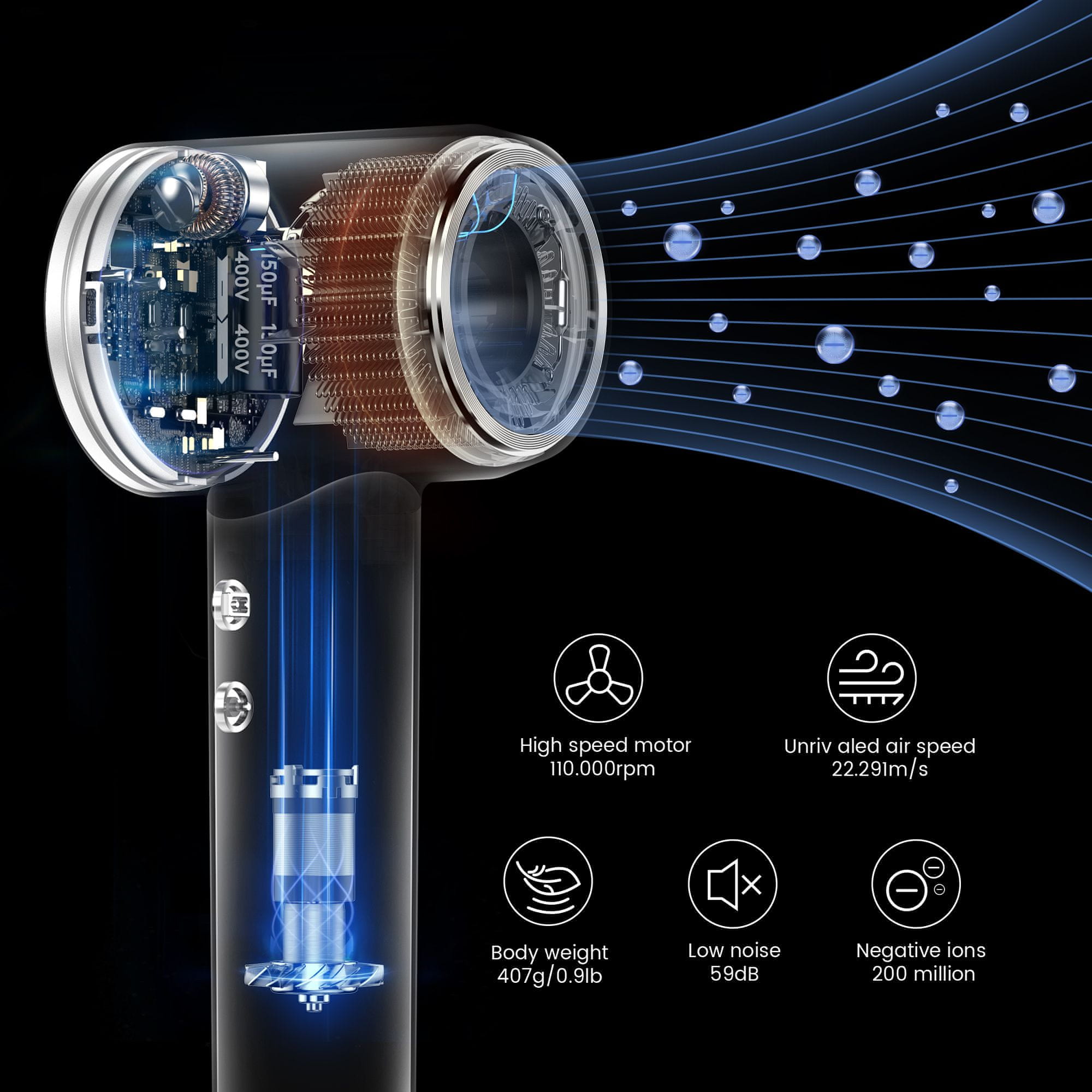 • Nevarnosti tradicionalnih sušilnikov za lase: pregrevanje - Tradicionalni sušilniki za lase z omejeno hitrostjo od 20 000 do 40 000 vrtljajev na minuto nimajo boljšega načina za hitrejše sušenje las kot zviševanje temperature sušenja, kar neizogibno povzroči poškodbe las.