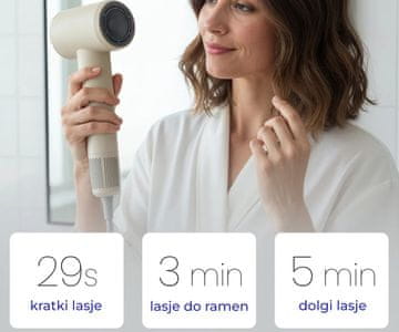 To vam omogoča, da lase posušite v samo 3 minutah – brez potrebe po visokih temperaturah, kar znatno zmanjša tveganje za prekomerno izsušitev las.