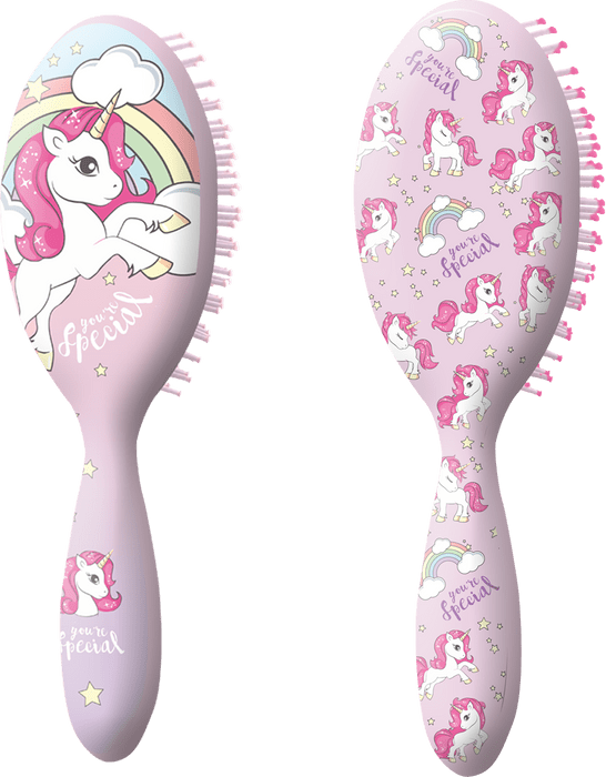 Čudovita krtača za lase z vzorcem samoroga, ki temeljito in nežno razvozla lase, ne da bi pri tem poškodovala. Kroglice na koncih krtače preprečujejo skodranje. Na voljo je v dveh različicah: z velikim vzorcem samoroga ali z vzorcem več samorogov (vidno na fotografijah).