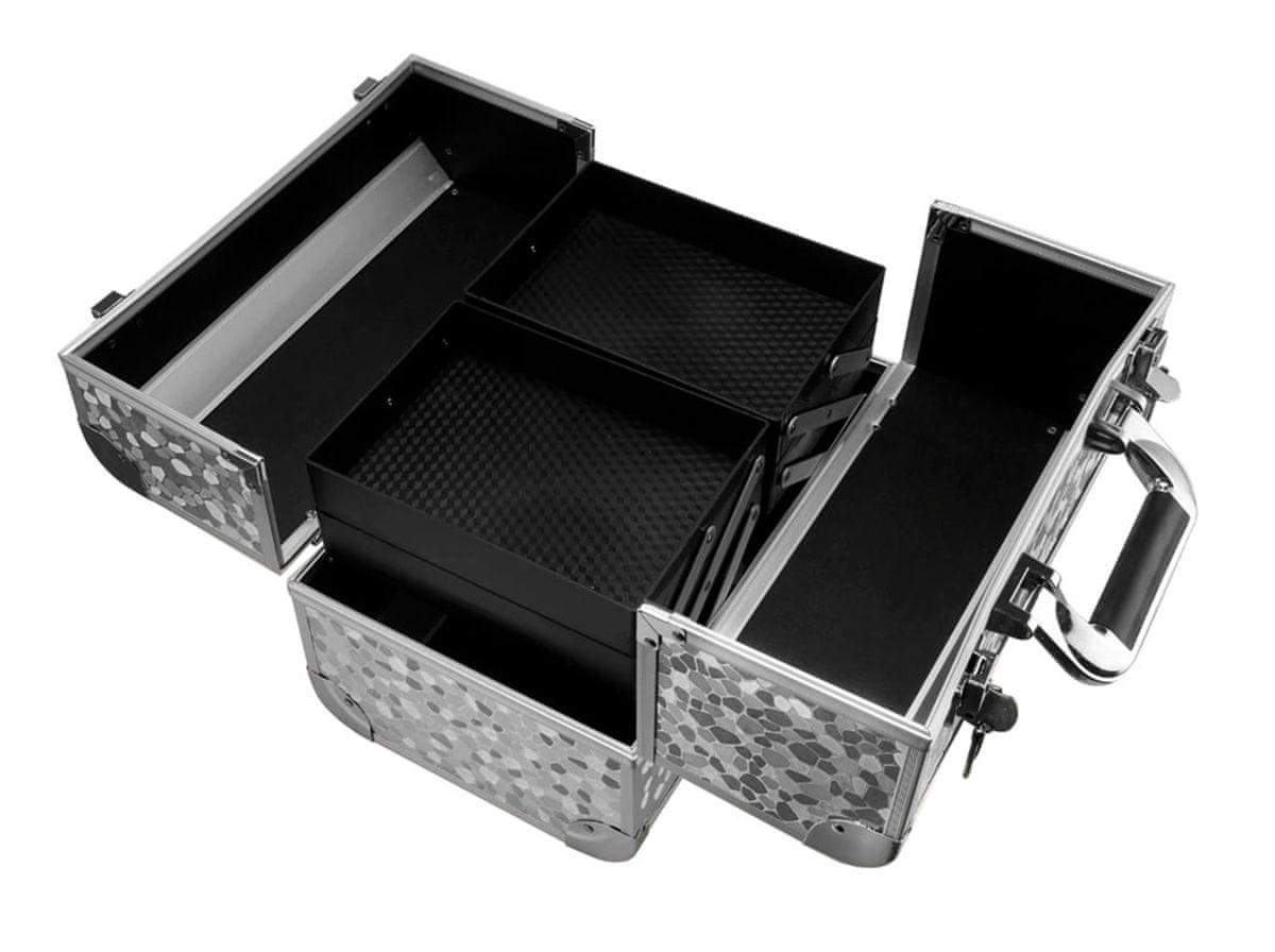 Priročen prtljažnik za prenašanje in shranjevanje kozmetike ali drugih manjših predmetov. Robustna konstrukcija kovčka bo vašo kozmetiko pred poškodbami zaščitila veliko bolje kot torbice in nahrbtniki. Nepogrešljiv pripomoček za kozmetičarke in stilistke, odpira se na obeh straneh. Opremljen je s 4 razširljivimi policami in prostornim glavnim predalom.