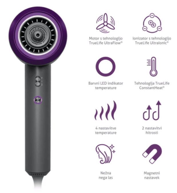 • TrueLife UltraIonic® tehnologija hitro in nežno posuši tudi poldolge in dolge lase