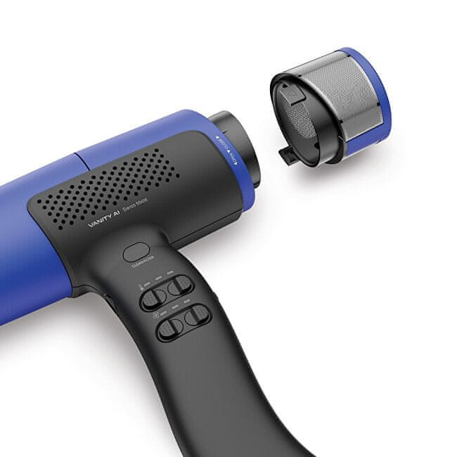 VanityCare AI Obsidian Blue 501.00VAEP VanityCare AI je prava mojstrovina, ki jo je podjetje Valera zasnovalo, razvilo in izdelalo v Švici. Je izjemno kompakten, zmogljiv, digitalen. Prepričal vas bo s svojo eleganco, funkcionalno zasnovo, natančnostjo in udobjem. Novi vzdržljivi visokohitrostni digitalni motor 100K-PAX dvigne zmogljivost na novo raven. S hitrostjo 100.000 vrt/min in življenjsko dobo do 5.000 ur dosega visok zračni tlak s pretokom 80 m3/h. Air Tehnologija Boost VanityCare AI je opremljen z edinstvenim sistemom ATB – Air Boost Technology, ki pomnoži količino izpihanega zraka z uporabo odprtin za dovod zraka nad ročajem. Nastavitve temperature in hitrosti, profesionalen oprijem in enostavna nastavitev 18 kombinacij temperature in hitrosti. Odlično za intenzivno uporabo v salonu. MAX – idealna nastavitev za močne in goste lase CARE – idealna nastavitev za tanke laseFunkcija pomnilnika Ko napravo izklopite, se zadnje nastavitve temperature in hitrosti shranijo v pomnilnik in se nastavijo ob naslednjem vklopu naprave. Funkcija samočistilnega filtra. Po 20 urah uporabe vas bo naprava VanityCare AI samodejno obvestila, da je treba očistiti filter. Funkcija samočiščenja filtra se preprosto sproži tako, da se dotaknete gumba Clean Filter, ko se spremeni smer pihanja. S tem preprečite, da bi se zračni filter zamašil. Močan, izjemno hiter pretok zraka je za ušesa skoraj neopazen, slišite le prijeten tihi zvok (67 dB).RotocordPatentirani sistem vrtenja Rotocord je vgrajen v ročaj. Sušilnik lahko vrtite na poljuben način, Rotocord pa preprečuje zapletanje kabla. Touch me coolUltra ozka zračna šoba, ki zaradi posebnega dvoslojnega sistema ostane hladna tudi med uporabo sušilnika za lase in je enostavna za upravljanje.