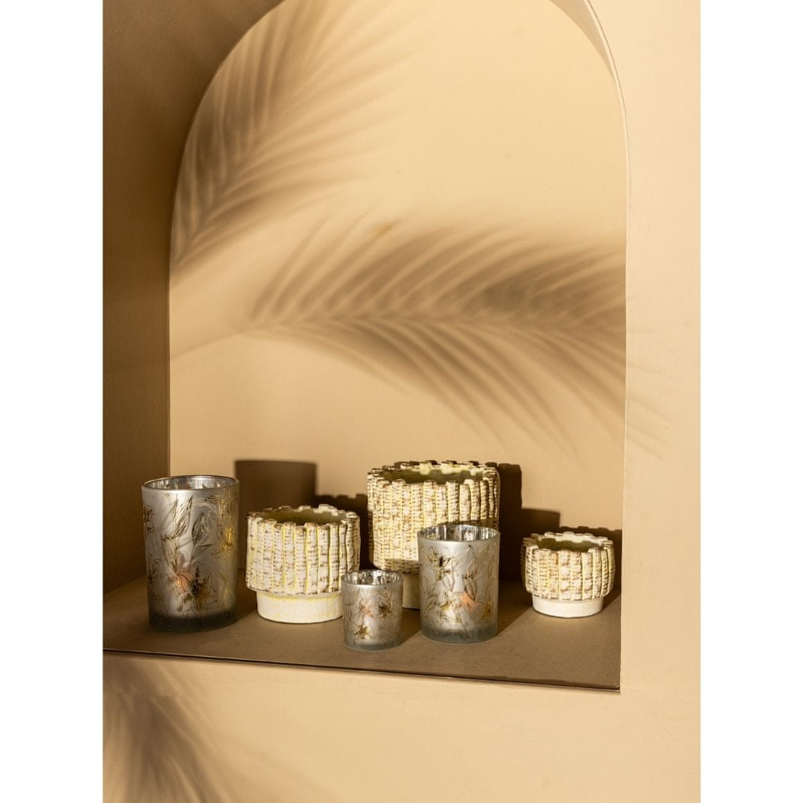 Ustvarite v svojem prostoru čarobno vzdušje z elegantnim steklenim svečnikom Beli stekleni svečnik AOLANI FLOWER, 10 cm. Ta svečnik v nežni beli barvi s cvetličnim zlatim dekorjem je popolna izbira za polepšanje dnevne sobe, spalnice ali slovesno pogrnjene mize. Svečnik je izdelan iz matiranega stekla in znotraj je srebrn, kar ustvarja čudovit svetlobni efekt.