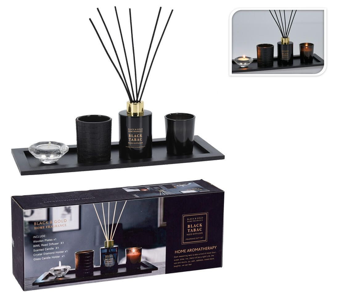 dimenzije: 38 × 15 × 0,95 cm material: les/steklo set vsebuje: difuzor, svečo v steklu, 2 x steklen svečnik, lesen pladenj