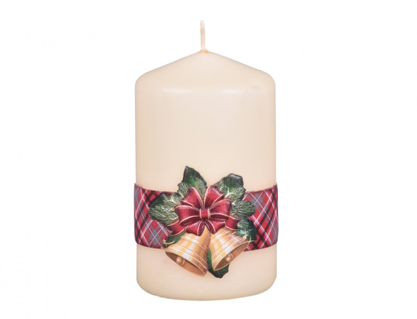 Sveča v obliki valja z reliefno podobo zvona na traku z lokom in svetinjo. Barva: bež. Premer: 6 cm, višina: 10 cm.