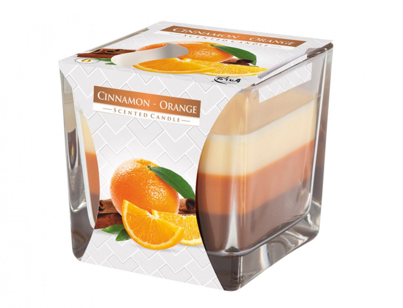 Dišeča sveča v debelostenskem steklu s 3 barvami voska. Ima 2 knota. Diši po cimetu in pomarančah. Čas gorenja: 32 ur Dimenzije: 8 × 8 × 8 cm. Teža polnila: 170 g.