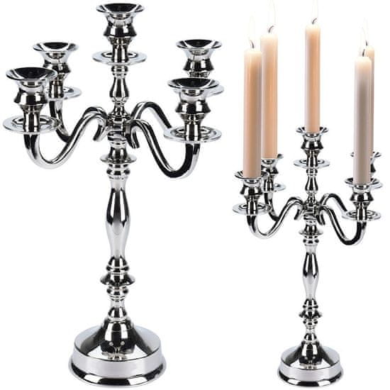 PETEROKRAEK – Petkraki svečnik v klasičnem slogu. Višina svečnika je 39,5 cm, širina pa 27 cm. KOVINA – Iz kovine srebrne barve, polirana do visokega sijaja. Svečnik je trpežen. STABILO – Svečnik ima stabilno podlago. Zasnovan za pet dolgih sveč, ki jih je mogoče namestiti na sredino in ob straneh svečnika. IMPRESIVNO – Svečnik deluje izjemno impresivno, če ga postavite na mizo ali predalnik. Popoln je za pripravo impresivne večerje v dvoje. GLAMUR STYLE – Popolnoma se prilega klasičnim in glamuroznim prostorom. Vsakemu interierju bo dodal sijaj in mu dal edinstven značaj. Petkraki kandelabrski svečnik. Zasnovan za dolge sveče. Zaradi visokega sijaja je na mizi videti izjemno impresivno. Uporabljamo ga lahko vsak dan, pa tudi ob posebnih srečanjih in dogodkih. Zaradi klasičnega vzorca bo videti izjemno v klasičnih interierjih, pa tudi v glamur urejenih interierjih. Za romantično vzdušje v domu lahko poskrbimo s svečnikom. Izdelano po evropskih standardih.
