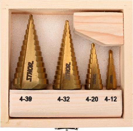 Set stopenjskih svedrov STHOR 22617 Zasnovan za vrtanje v visokokakovostno nerjavno, konstrukcijsko in hladno valjano jeklo, barvne kovine, jekleno pločevino, plastiko. – Robovi lukenj ostanejo čisti in brez ostružkov – sveder na zaobljenih in spolzkih površinah ne uhaja – samocentriranje na zaobljenih in spolzkih površinah – hitro odvajanje toplote pri vrtanju v trde materiale – izdelan iz hitrega jekla HSS, prevlečenega s titanovim nitridom – stopnjevanje v korakih po 2 in 3 mm. Cilindrično držalo.