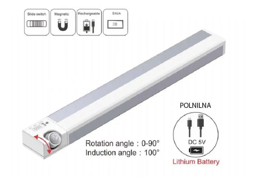 Razsvetlite svoj prostor s Polnilno Magnetno LED Svetilko s Senzorjem Gibanja! Ta elegantna in praktična svetilka je idealna za omaro, posteljo, kuhinjo in druge prostore, kjer potrebujete diskretno osvetlitev.