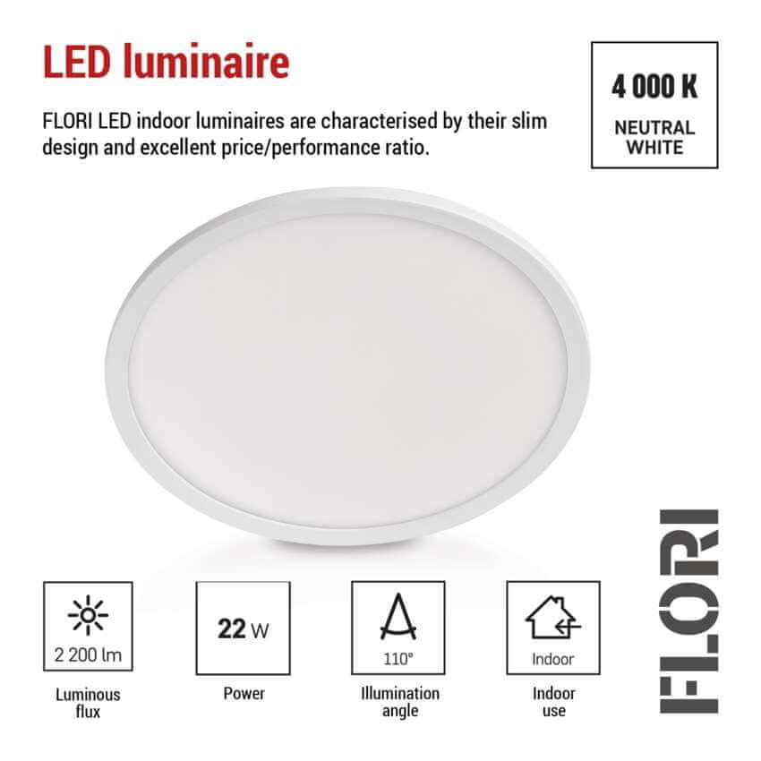 vir svetlobe: LED • prihodna moč: 22 W • nadomestilo za žarnico: 130 W • zaščita: IP20 • svetlobni tok: 2 200 lm • barva svetlobe: nevtralna bela • oblika: krog • material ohišja: plastika • material difuzorja: plastika • tip difuzorja: mlečen • kot svetilnosti: 110° • način montaže: nadometno Celoten opis