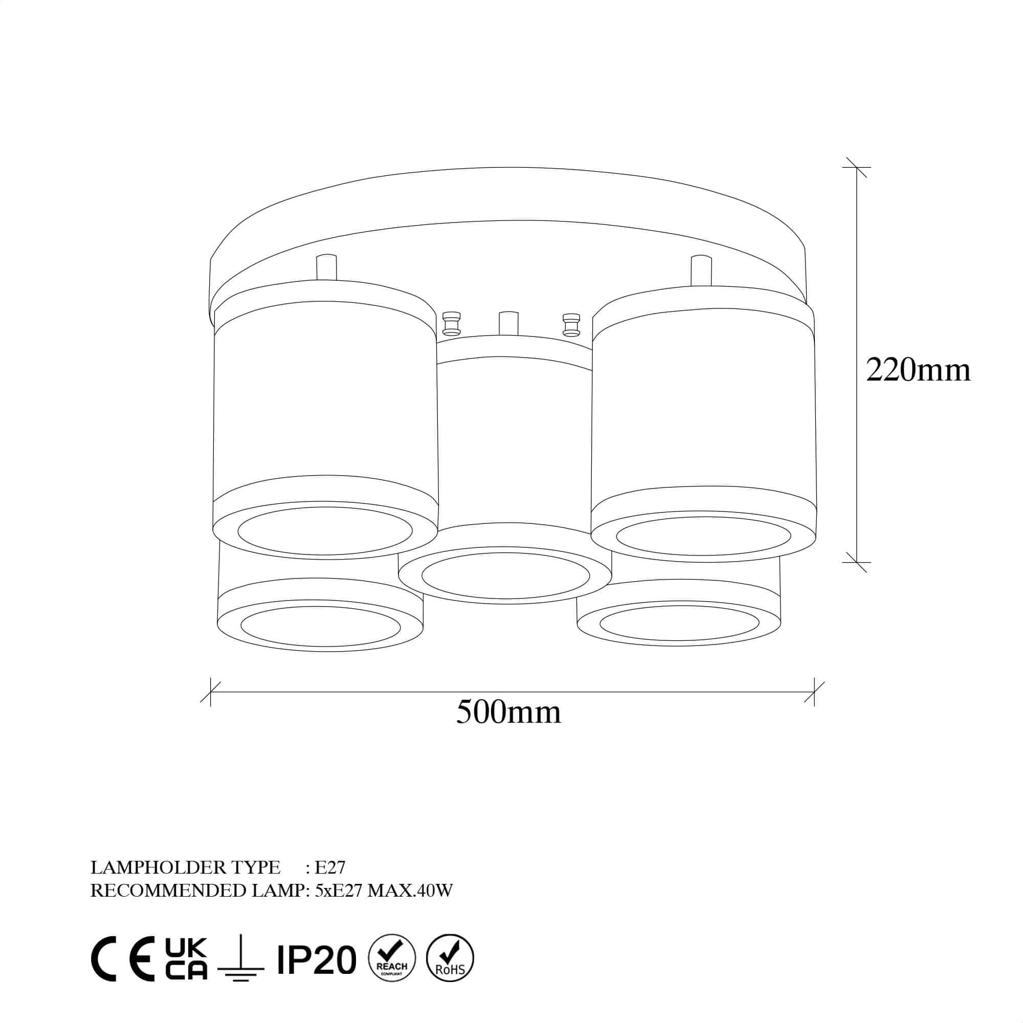 KOVINSKO TELO Pokrovček iz tkanine Premer kape: 14 cm Višina kape: 14 cm Velikost: 50 × 50 × 22 cm Premer osnovne plošče: 40 cm Višina osnovne plošče: 3 cm IP20 Tip vtičnice: Vtičnica: 5 x E27 Max 40 W