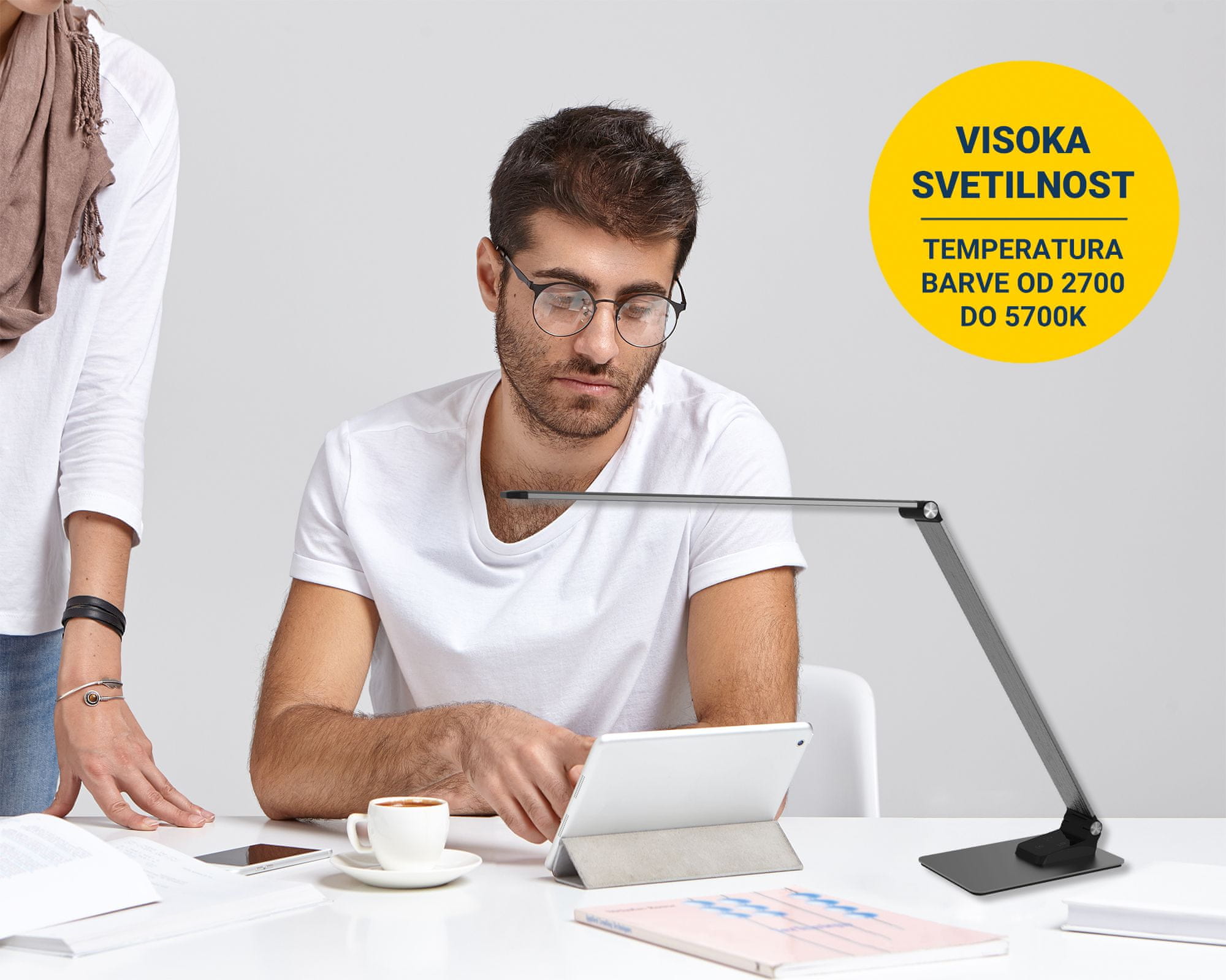 Moderna namizna LED svetilka proizvajalca Platinet je izjemno varčen, okolju prijazen in priročen pripomoček v vašem domu ali pisarni. 48 LED SMD diod omogoča enakomerno osvetlitev delovne in pisalne mize, nočne omarice v spalnici ali kotička za branje. Nastavljiva in zložljiva svetilka nudi možnost izbiranja med tremi temperaturami barve (2800 K – 5700 K) in tremi nivoji jakosti osvetlitve z maksimalno svetilnostjo 500 lumnov.