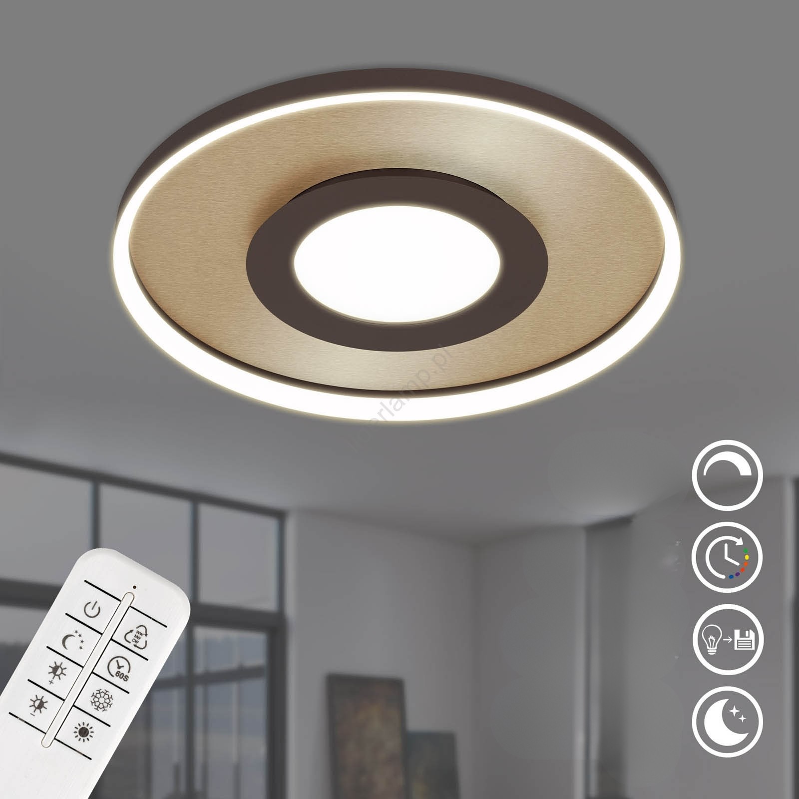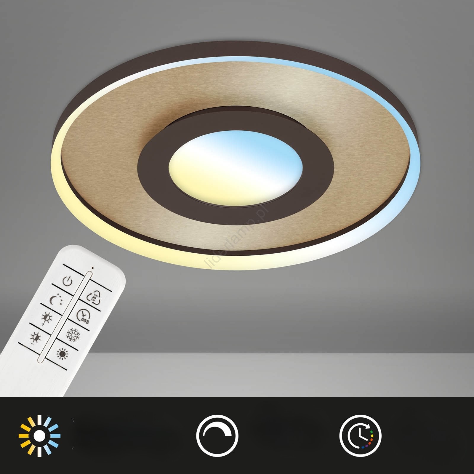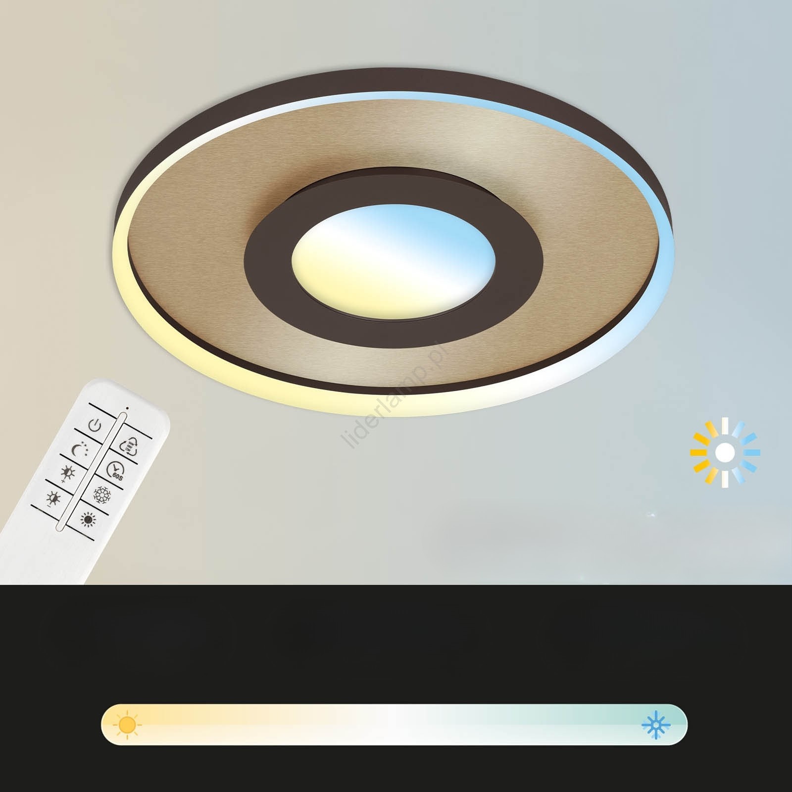 Moderna LED stropna svetilka z daljinskim upravljalnikom – zlata notranjost in temno rjav dizajn