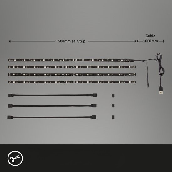 • Vse, kar potrebujete, je priloženo – 2 m LED trak z USB kablom, daljinskim upravljalnikom, tremi priključki in tremi priključnimi kabli.