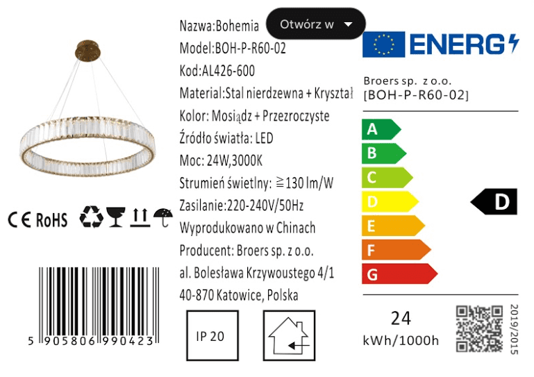 Bohemia 60 AL – LED kristalni lestenec obroč 60 cm medenina Ponujamo edinstveno visečo svetilko, ki je Bohemia 60 AL – LED kristalni lestenec impresivne oblike obroča s premerom 60 cm, izdelan iz medenine. Ta elegantna svetilka je popolna kombinacija sodobnega dizajna in luksuznega zaključka. Opis: Tip: Viseča svetilka Material: Iz kovine in prozornega kristalnega stekla Barva: Medenina Višina: Maksimalno 100 cm, možnost skrajšanja obešanja Obešanje: Tip A – standardno, koncentrične niti se povezujejo v eno stropno ploščo Mere: Premer obroča: 600 mm Višina obroča: 80 mm Svetlobni vir: Vgrajen LED trak Moč: 30W Barvna temperatura: 3000K Visoka svetlobna učinkovitost: >90lm/W Bohemia 60 AL ni le funkcionalen vir svetlobe, ampak tudi edinstven dekorativni element, ki bo vsakemu prostoru dodal eleganco in edinstven značaj. S svojo osupljivo obročasto obliko in kristalnim okvirjem bo ta svetilka v vašo notranjost vnesla edinstven čar. Ta svetilka ni samo vizualno lepa, ampak je zaradi učinkovitega LED traku tudi varčna z energijo. Ponuja prijetno, toplo in kakovostno svetlobo, ki bo odlično osvetlila vsak prostor. Če iščete svetilko, ki združuje sodobnost z razkošjem in vašemu interierju doda edinstven sijaj, je Bohemia 60 AL popolna izbira. Zdaj na voljo po privlačni ceni, ki zagotavlja ne le funkcionalnost, ampak tudi eleganco in edinstven dizajn.