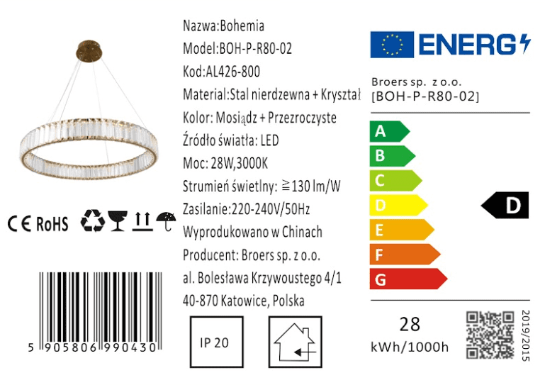 Bohemia 80 AL – LED kristalni lestenec 80cm medenina Bohemia 80 AL – LED kristalni lestenec s premerom 80 cm v medeninasti izvedbi Lastnosti izdelka: Vrsta: Viseča svetilka Material: Visokokakovostna kovina in prozorno kristalno steklo Barva kovine: Sijoča medenina, ki daje eleganco Višina: Nastavljiva do največ 100 cm z možnostjo krajšanja Mere vzmetenja: Premer obroča: impresiven premer 800 mm Višina obroča: 80 mm Sodoben svetlobni vir: Vgrajen LED trak Moč: 40 W Barvna temperatura: 3000 K, ki zagotavlja toplo in prijetno svetlobo Visoka svetlobna učinkovitost: Več kot 90 lm/W Prednosti lestenca Bohemia 80 AL: Ekskluziven videz: Kristalni LED obroč in edinstven medeninast zaključek daje svetilki edinstven značaj. Prilagoditev notranjosti: Nastavljiva višina in možnost skrajšanja vzmetenja omogoča popolno prileganje vsakemu prostoru. Varčevanje z energijo: LED trak ne le spektakularno osvetljuje prostor, ampak tudi pomaga zmanjšati porabo električne energije. Najvišja kakovost: Izdelan iz najkakovostnejših materialov in natančne izdelave, ki zagotavlja zanesljivost in dolgoročno zadovoljstvo. Lestenec Bohemia 80 AL je popolna kombinacija modernega dizajna in luksuza, ki bo zagotovo poživila vsak interier. Zdaj lahko ta edinstveni element vnesete v svoj dom. Zagotovite si ne le odlično osvetlitev, ampak tudi edinstveno dekoracijo, ki bo vašemu prostoru dodala čar in stil.