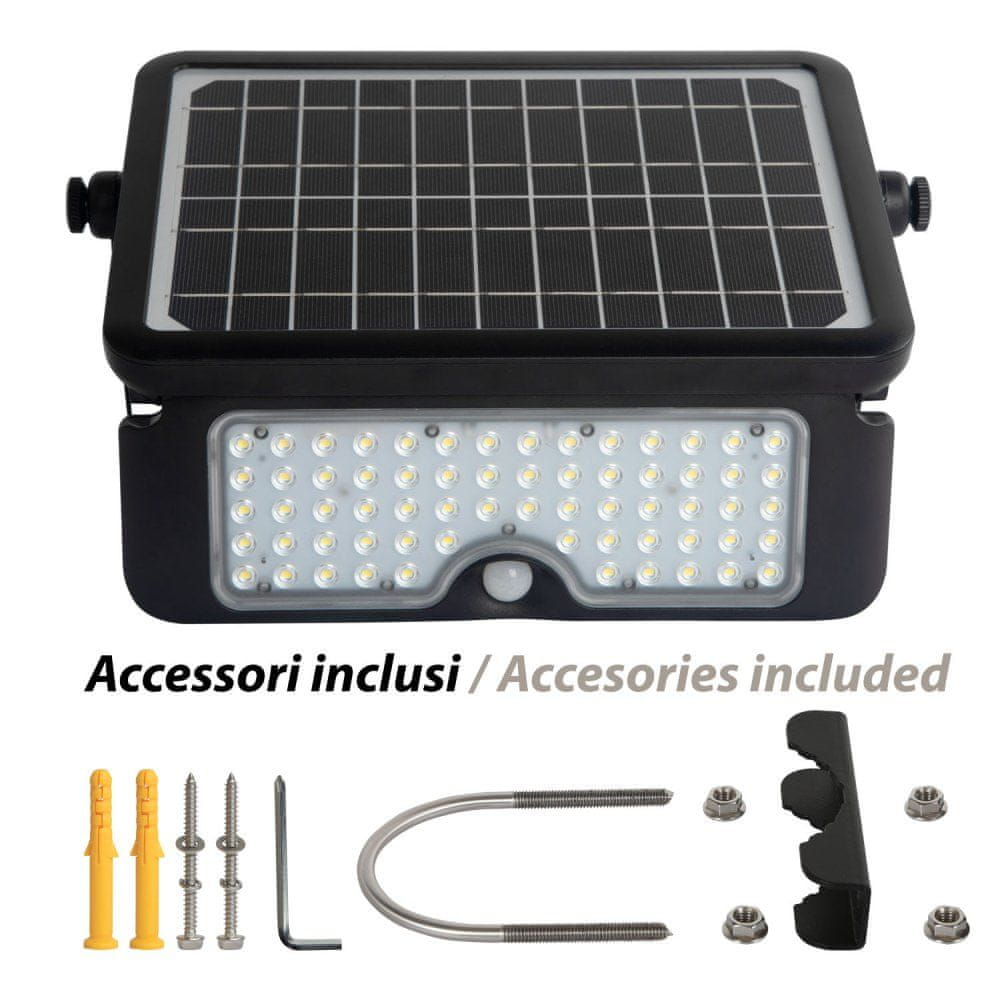 Izjemno svetel: 10W solarni reflektor je opremljen s 64 LED SMD, ki zagotavljajo izjemno močan svetlobni tok 1150 lumnov. Sončna plošča je vgrajena v reflektor: je kompaktna in enostavna za namestitev, brez nadležnih kablov.