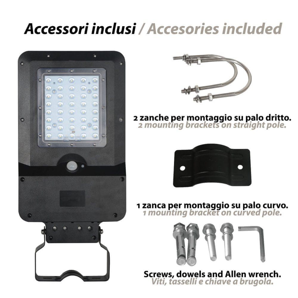 Načini delovanja: 1) Prvih 5 ur osvetlitve: vedno vklopljen pri 20 % moči. Ko zazna gibanje na razdalji 8 metrov, se vklopi z največjo močjo (1600 lumnov). Po 20 sekundah brez premikanja se svetlost vrne na 20 % moči. največja svetlost.