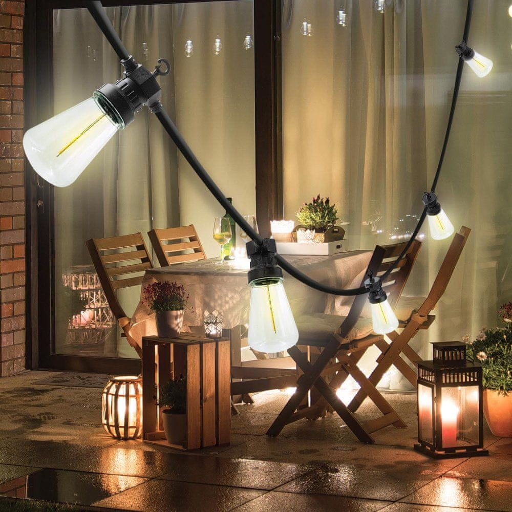 Zunanja svetlobna veriga z 20 retro žarnicami, primerna za vrtno zabavo. Razširljiv