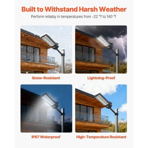 Ta komplet solarnih uličnih svetilk je zasnovan za močno in energetsko učinkovito zunanjo osvetlitev za komercialne in stanovanjske prostore. Idealno za parkirišča dovozne poti dvorišča in druge velike površine te svetilke nudijo širok kot osvetlitve in zanesljivo delovanje v različnih vremenskih pogojih. Z inteligentnimi funkcijami upravljanja in enostavno namestitvijo so praktična rešitev za izboljšanje varnosti in vidljivosti na prostem.