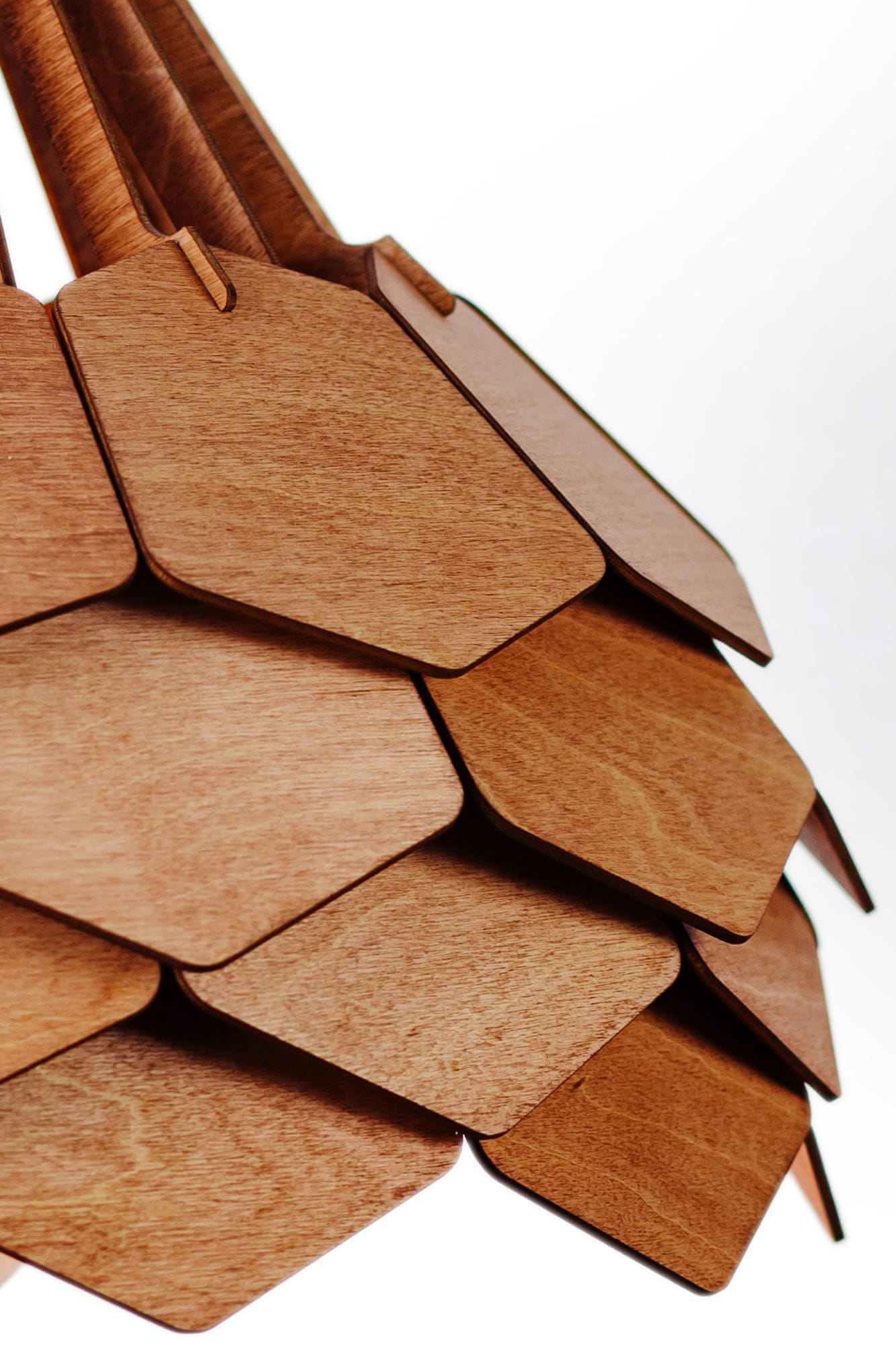 Brezove “luskice”, obdelane z naravnim voskovim oljem, se zložijo v elegantno strukturo. Lesena viseča svetilka postane osrednji element vsakega prostora zahvaljujoč nenavadni kombinaciji inovativnega dizajna in popolnoma naravnih materialov. Uporabili smo brezovo vezano ploščo in naraven voskov premaz, ki poudari teksturo lesa.