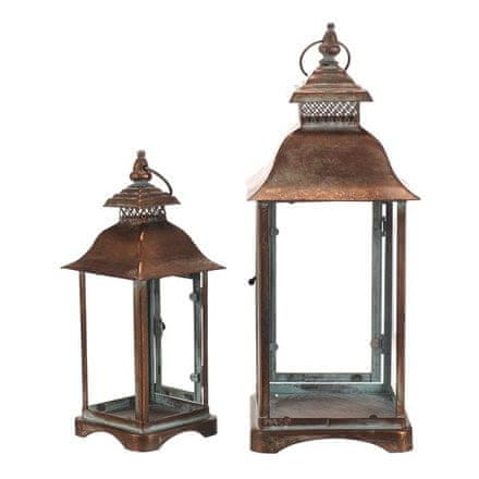 Komplet dveh kovinskih svetilk v bakrenem senčniku v notranjost ali zunanjost vnese tradicionalno vzdušje s pridihom vintage sloga. Štiristranska zasnova s ??prozornimi steklenimi stenami omogoča enakomerno razpršitev svetlobe sveč v notranjosti. svetilke so opremljene s praktičnimi odpiralnimi vrati in zgornjim kovinskim obročem za enostavno prenašanje ali obešanje. Robustno kovinsko podnožje zagotavlja stabilnost in dolgo življenjsko dobo. Primerno za dekorativno osvetlitev na terasi, balkonu ali v dnevni sobi.