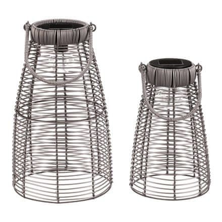Komplet dveh stožčastih latern iz sivega poliratana ponuja praktično LED osvetlitev, primerno za zunanjo in notranjo uporabo. Lanterne imajo trdno podlago in trpežno zasnovo, ki zagotavlja stabilnost in enostavno vzdrževanje materiala. Vključuje integrirano LED luč, ki jo napaja sončna energija, kar ustvarja prijetno vzdušje brez potrebe po priključitvi na električno omrežje. Zahvaljujoč ratanovemu videzu je videti dekorativno in hkrati funkcionalno, idealno za osvetlitev teras, vrtov ali balkonov. LED osvetlitev napaja 1 x AA polnilna baterija in sončna celica, ki se nahaja na zgornjem robu.