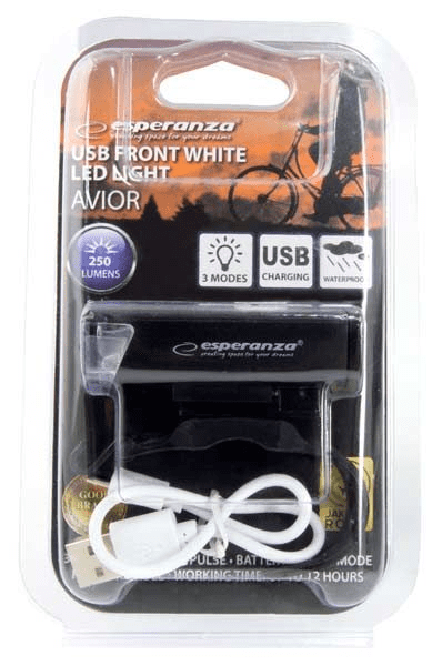 Sprednja kolesarska svetilka Esperanza AVIOR ima močno belo LED ČIP XPE, ki oddaja močno svetlobo s tokom 250 lumnov. Zahvaljujoč temu, bo po temi zelo dobro osvetljena cesta pred vami in vidni boste ostalim uporabnikom prometa. Naprava ima 3 načine osvetlitve. Žarnica ima vgrajeno baterijo in se polni prek kabla USB. – Zelo močna svetloba 250lm