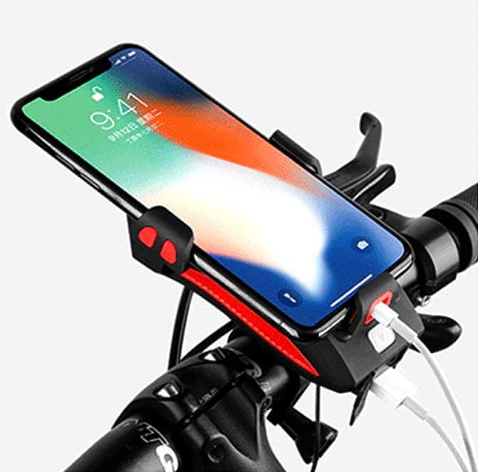 Komplet luči za kolesa vključuje sprednjo svetilko z držalom za telefon, napajalno enoto in funkcijo hupe ter zadnjo svetilko. Sprednja svetilka za kolo ima dve svetlobni točki, ki zagotavljata odlično osvetlitev ceste, in tri vgrajene načine osvetlitve. Celoten opis