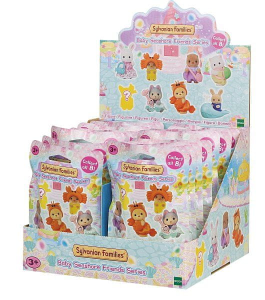 Razkošni malčki iz družine Sylvanian Families se odpravijo iskat zaklad, skrit v palači malih morskih deklic. Komplet vsebuje 8 različnih otroških figuric skupaj z dodatki, ki jih lahko zbirate ali se z njimi igrate. Figurice in dodatke iz kompleta je mogoče kombinirati z drugimi kompleti, hišicami in dodatki Sylvanian Families. Figurice imajo premične glave, roke in noge. Zberite vseh 8 figuric in si zamislite neverjetne zgodbe, ki temeljijo na morju in morskih dejavnostih. Zbirka vključuje otroško perzijsko mačko in njen želvji oklep, otroškega hrčka in njegovo torbo v obliki školjke, otroško vidro in njen klobuk v obliki rakovice, otroškega snežnega zajca in njegovo modro torbo v obliki ribe, otroškega mlečnega zajca in njegovega kita, otroškega medveda in njegov kostum rakovice, otroškega huskija in njegovo rožnato žezlo z ribo ter figuro otroškega skrivnega presenečenja. Vsaka vrečka vsebuje eno figurico. Asorti je naključna mešanica modelov. Na izbor ni mogoče vplivati. Pakirano v vrečki. Dimenzije vrečke: 15,5 × 10,2 × 2,3 cm. Starost: 3+