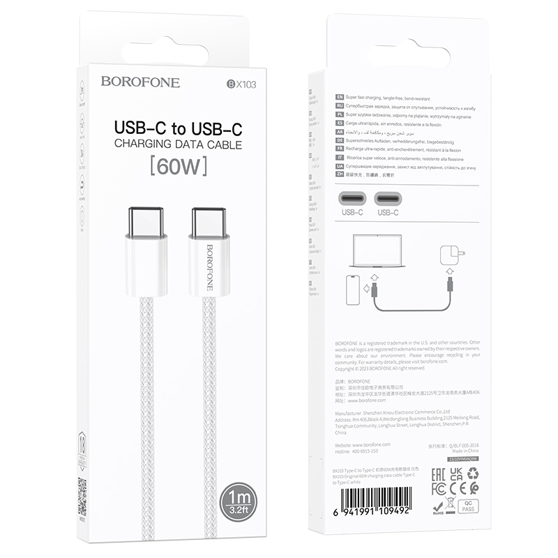 Borofone BX103 Original USB-C na USB-C kabel 60W 3A 1m bel Celoten opis