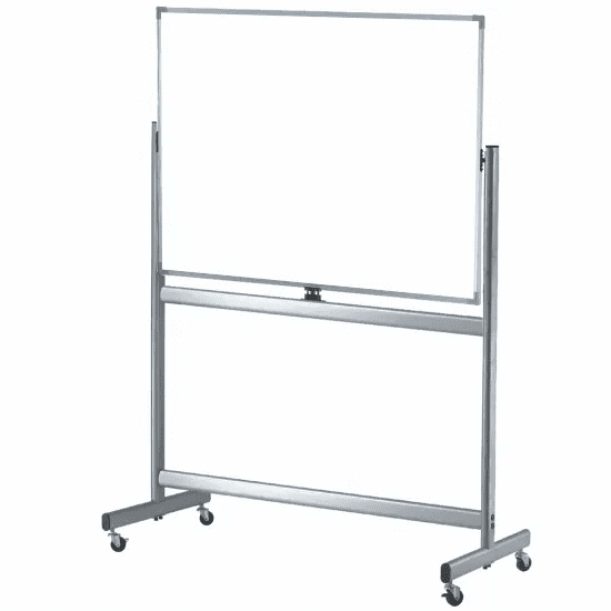 MOBILNA bela magnetna tabla z dvostransko vrtljivo pisalno površino ima lakirano pisalno površino za hitro in enostavno brisanje Piši-Briši markerjev z magnetno gobico, omogoča pa tudi pritrjevanje papirja z magneti. S srebrnim robustnim stojalom se jo lahko postavi kamorkoli, ker pa ima kolesca z zavorami je tudi poljubno premična. Tabla je vrtljiva tako naprej. kot tudi nazaj (prekucna za 180° ali 360°).