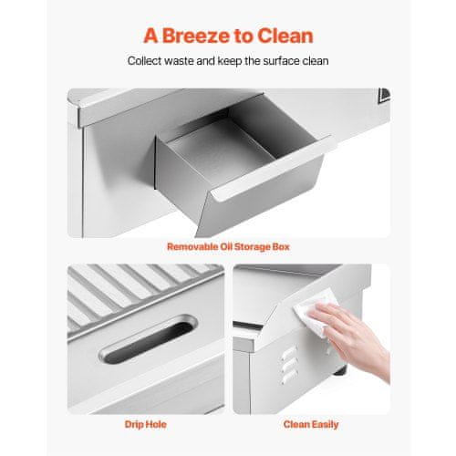 Ta komercialni električni žar je zasnovan tako za profesionalne kuhinje kot tudi za domačo uporabo ponuja prostorno kuhalno površino primerno za pripravo različnih jedi kot so zrezki palačinke in burgerji. Njegovo robustno ohišje iz nerjavečega jekla in železna kuhalna plošča zagotavljata vzdržljivost in enakomerno porazdelitev toplote medtem ko nastavljiv nadzor temperature omogoča natančne rezultate kuhanja. Žar je opremljen s praktičnimi dodatki in funkcijami ki olajšajo čiščenje in varno uporabo zaradi česar je idealen za restavracije stojnice s hrano in catering dogodke.
