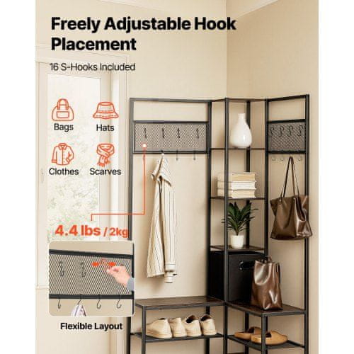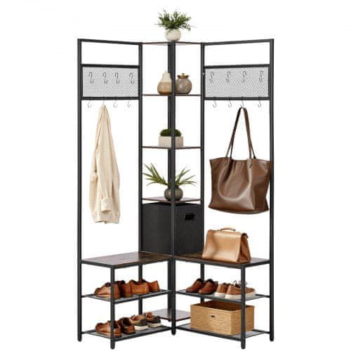 Ta vogalni vhodni regal maksimira shranjevanje v predsobi z obešalnikom za plašče, nastavljivimi kljukami in vgrajeno klopjo za preobuvanje. Njegov robusten jekleni okvir in komplet proti prevrnitvi zagotavljata stabilnost, zaradi česar je idealen za organizacijo oblačil in čevljev. Celoten opis
