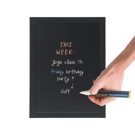 Securit® stenska ČRNA TABLA Woody v lesenem okvirju ČRNE barve 30×40cm z obojestransko pisalno površino za mokrobrisne markerje s tekočo kredo + pribor za montažo ter BEL marker. Celoten opis
