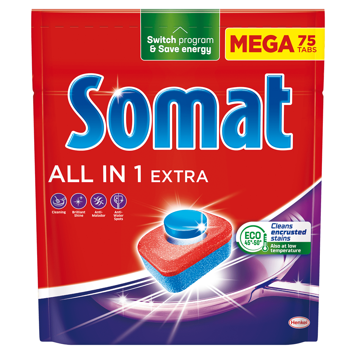 Dosezite najboljše rezultate s Somat All in 1 Extra tabletami za pomivalni stroj, ki pustijo vašo posodo popolnoma čisto in sijočo. Tudi pri nizkih temperaturah odstranijo trdovratne madeže in ostanke čaja ali kave.
