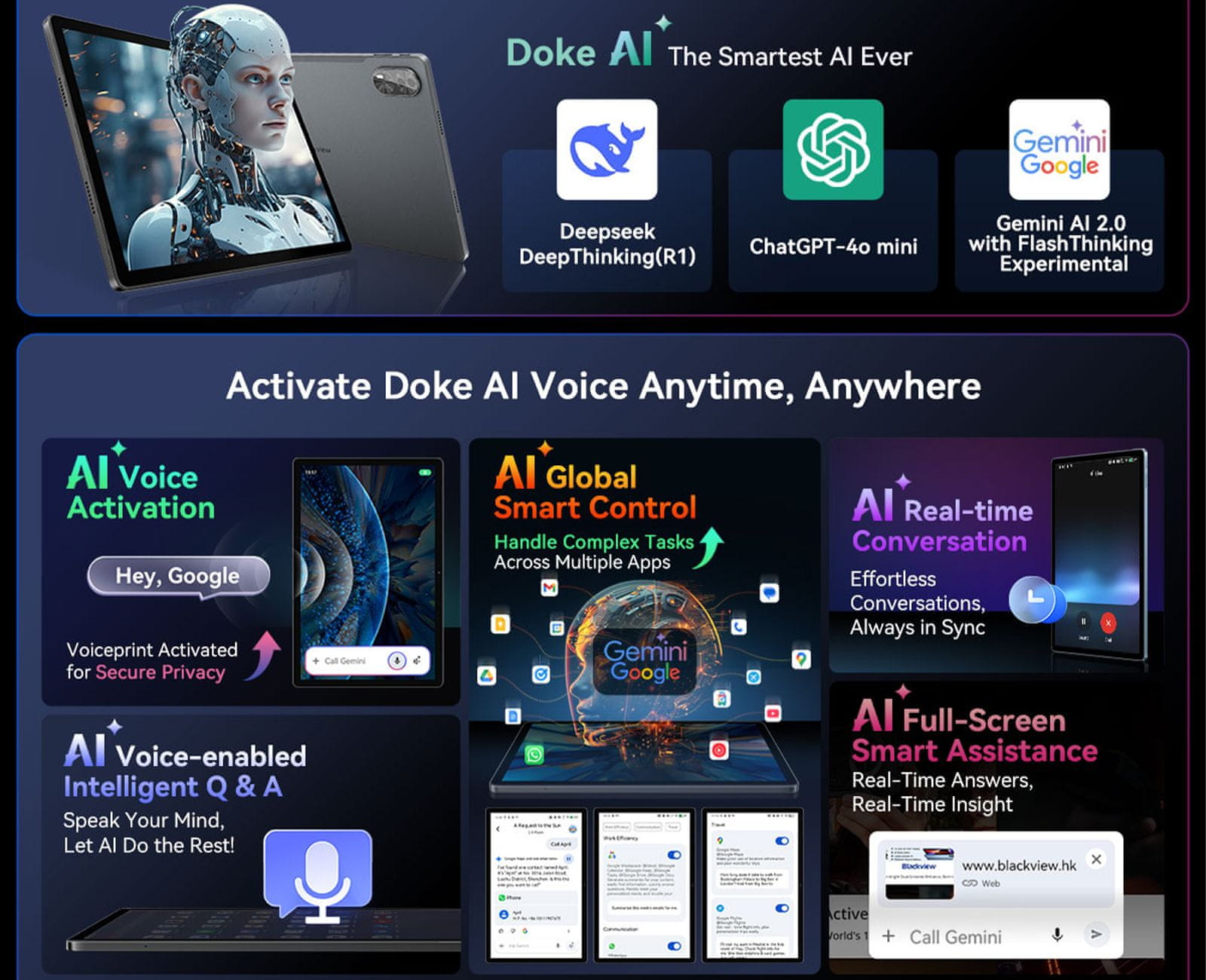 Doke AI v Blackview MEGA 8, ki ga poganjajo trije najboljši modeli umetne inteligence na svetu – ChatGPT, DeepSeek in Google Gemini – vam ponuja orodja s katerimi boste uresničili vaše ideje lažje kot kdaj koli prej!