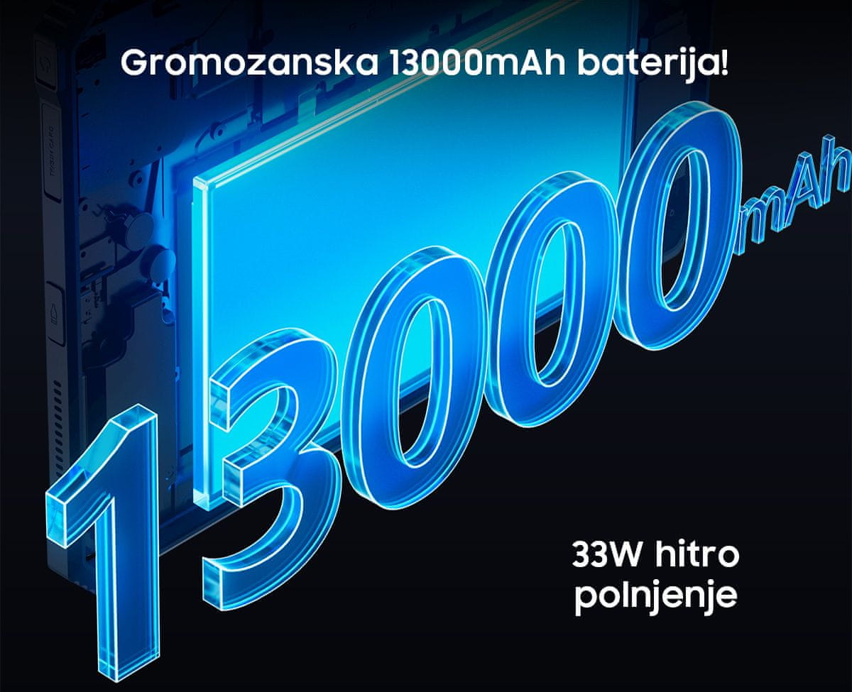 | Lastnosti in funkcije | razširljiv RAM iz 8GB na 16GB, Dual SIM, 4G LTE, STEREO zvočniki, ogromna 13000mAh baterija, PC Mode način uporabe, Dark Mode način uporabe, Gaming način uporabe, robustno ohišje, tanek dizajn, prednja 16MP in zadnja 13MP kamera, razširljiv notranji spomin do 1TB, priloženo stylus pisalo, 33W hitro polnjenje, prednameščen paket aplikacij, GPS navigacija, vojaški nivo trpežnosti, varnostno ojačan Linux sistem, odklepanje s prepoznavo obraza, napreden hladilni sistem, pametno predhodno nalaganje aplikacij, Google Lens tehnologija, podvodno fotografiranje… |