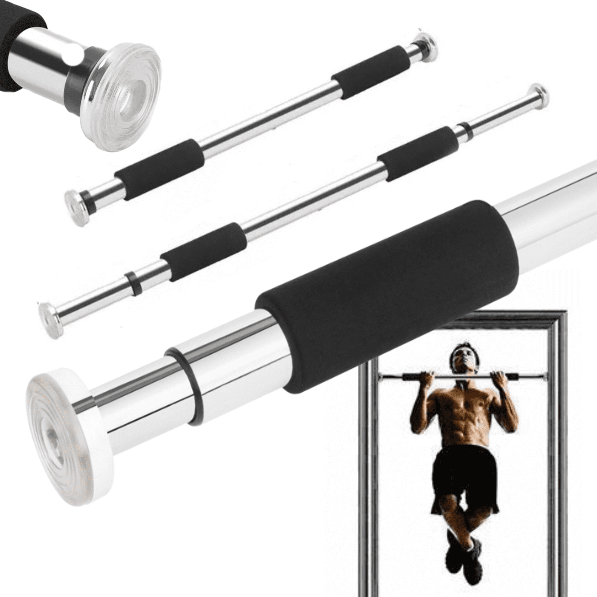 Palica ponuja nastavljivo dolžino od 62 do 100 cm, kar omogoča, da se prilega različnim širinam vrat ali drugim mestom namestitve. Cev s premerom 3 cm in podnožje s premerom 5 cm zagotavljata trdno pritrditev in stabilnost med uporabo.