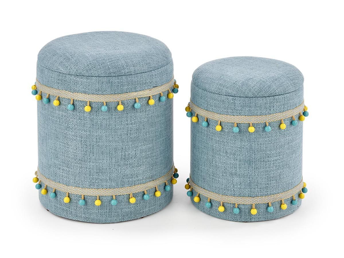 Igrivi tabure (2 kom) GRADO s preprostim dizajnom, dopolnjenim s pisanimi dekoracijami po celotnem obodu tabureja bo popestril in razveselil, ne glede na to, ali gre za dnevno sobo, otroško sobo ali spalnico. To je komplet dveh taburejev, ki skrivata praktičen prostor za shranjevanje, v katerega lahko pospravite različne stvari. Dobavljamo jih sestavljene, največja nosilnost pa je 100 kg. Dimenzije manjšega tabureja so (ŠxGxV): 30×30×37 cm in večjega (ŠxGxV): 38×38×44 cm. Uporabite jih lahko kot občasen prostor za sedenje ali samo za dvig nog med počitkom. Barvna različica je prijetne, svetlo modre barve.
