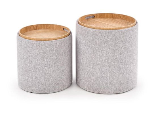 Komplet dveh AVIKO taburejev (2 kom) morate imeti doma! Ta eleganten in na prvi pogled preprost element skriva skrivnost. S preprostim obračanjem pokrova ga lahko spremenite v praktično mizo za shranjevanje. Kako želite uporabljati Aviko, je odvisno od vas. Prostor za shranjevanje, ki ga imajo, je bonus. Izdelane so iz blago sive barve v kombinaciji z MDF in naravnim furnirjem. Dimenzije večjega tabureja so (ŠxGxV): 38×38×45 cm in manjšega (ŠxGxV): 35×35×39 cm. Dostavljeno razstavljeno.