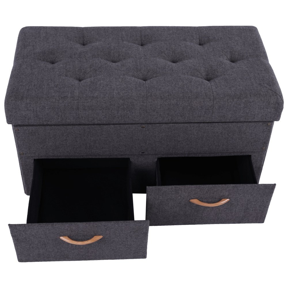 Oblazinjen tabure je večnamenski kos pohištva, katerega lastnosti boste zagotovo cenili. Vsestranskost tabureja SULOT TIP 2 vas bo takoj navdušila. Ima moderne šive, oblečena je v sivo blago. Tabure ima prostor za shranjevanje pod snemljivim pokrovom in dva predala z edinstvenimi ročaji, ki ga naredijo še bolj ekskluzivnega. Njegove dimenzije so (ŠxGxV): 84×42×43 cm, nosilnost stolčka je 100 kg. Tabure je preprost, lahek, prenosljiv in rokovanje z njim v prostoru je res prava stvar. Dobavi se razstavljen, njegova teža je 13 kg.
