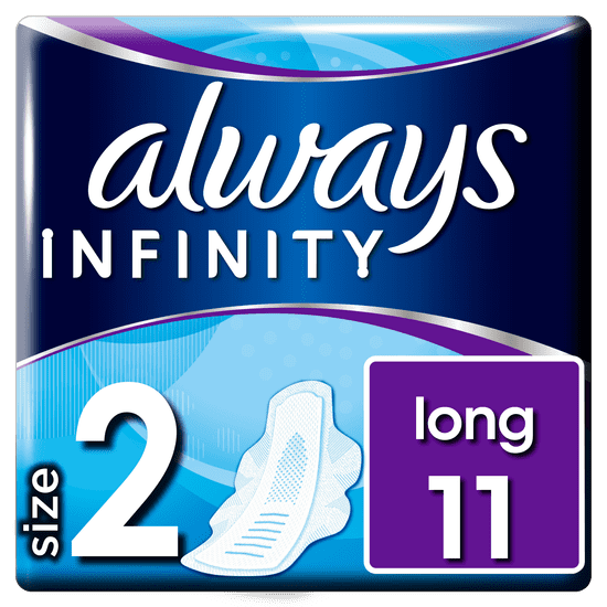 Always Infinity Long Wing (velikost 2) je prvi vložek s peno SmartFoam na svetu. Mikro luknjice tekočino povlečejo globoko v notranjost, kar zagotavlja občutek suhosti, posebni kanali pa ščitijo pred uhajanjem in zagotavljajo prožnost.  Celoten opis