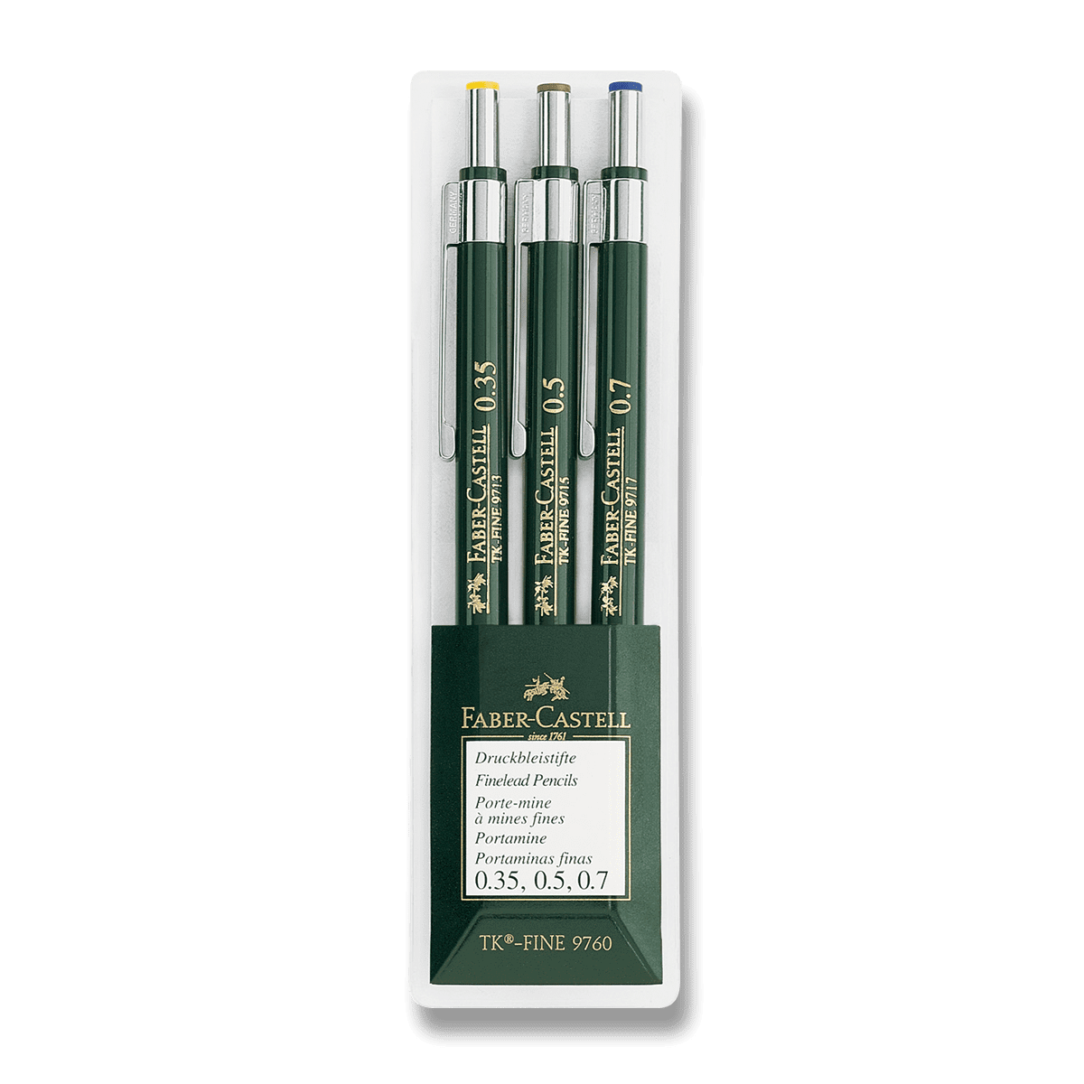 • barvno razlikovanje svinčnikov glede na debelino črnila, * izjemno dolga kakovostna guma, * 3 kosi nadomestnih črnil HB, * izvlečna vodilna cev, * pokrov se po pritisku na mehanizem stiskanja s pritiskom na trdo blazinico umakne, * primeren za šablono, Faber-Castell začel v 60. letih. V 60. letih prejšnjega stoletja je proizvodnja izjemno finih, a obstojnih polimernih črnil privedla do razvoja mikrošablon TK s širino sledi od 0,35 mm.