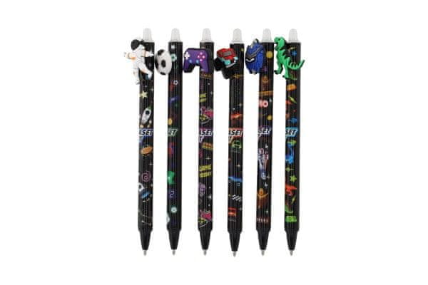 Gumijasto pero vsebuje posebno črnilo, ki se imenuje izbriši in prepiši ali izbriši in pusti, da se ponovno pojavi. Če naredite napako, preprosto obrnite pisalo in plastična konica bo izbrisala besedilo. Konica radirke segreje črnilo, to izgine in ga lahko ponovno napišete. Napišete lahko celo skrivna sporočila, po brisanju samo ohladite papir pod lediščem in besedilo se bo znova pojavilo. Velikost pisala: 16 cm. Ni igrača