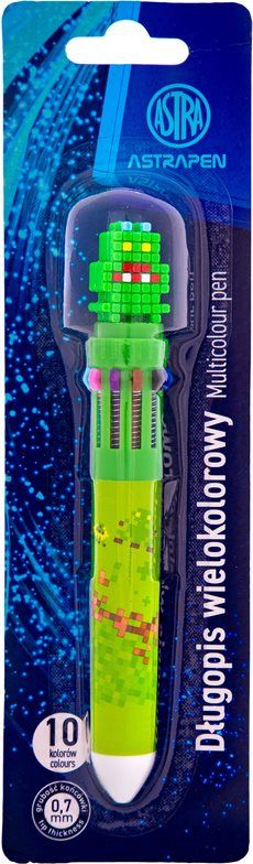 Kroglično pero z desetimi barvnimi polnili z motivom Pixel One. Celoten opis