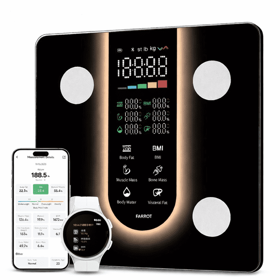 BergMont Premium pametna osebna tehtnica Bluetooth 180 kg z analizo telesa – 21 funkcij, aplikacija v slovenščini