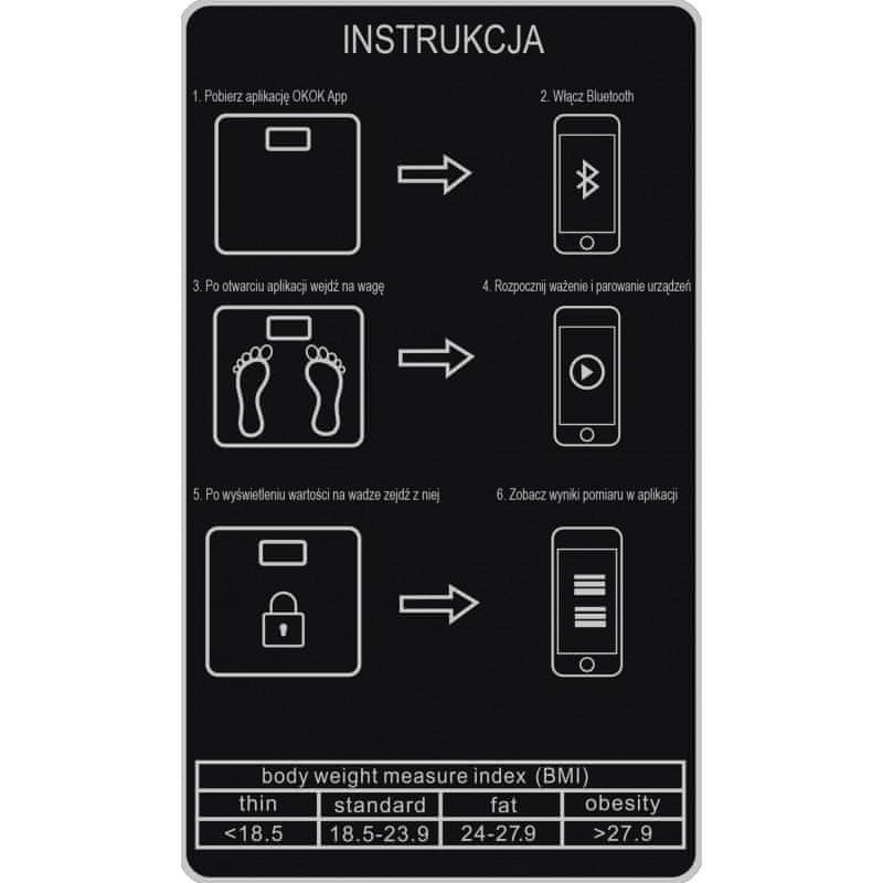 Te tehtnice so izdelane iz kakovostnega kaljenega stekla, so bele barve in se ponašajo s sodobnim, elegantnim dizajnom. Njihova nosilnost znaša do 180 kg, kar zagotavlja, da je primerna za široko publiko. Z minimalno težo 3 kg so primerne za vsakogar, ki želi spremljati svoje telo.